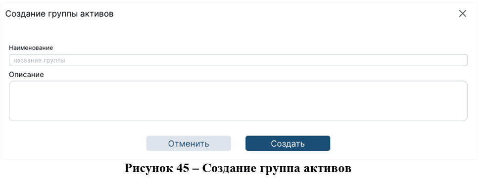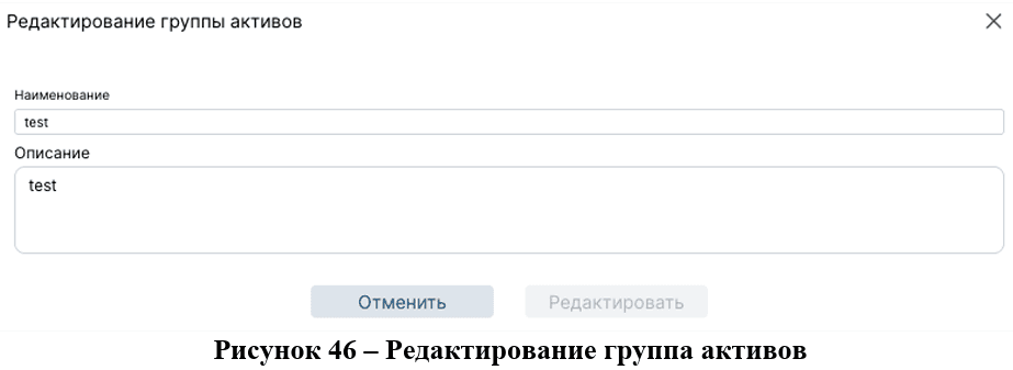 Для того, чтобы отредактировать группу необходимо выбрать группу в левой боковой панели на странице «Активы» (рис.44) и нажать на "🖉", после чего появится модальное окно с возможностью изменения наименования группы (рис.46).