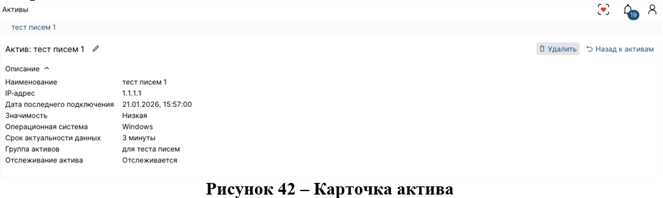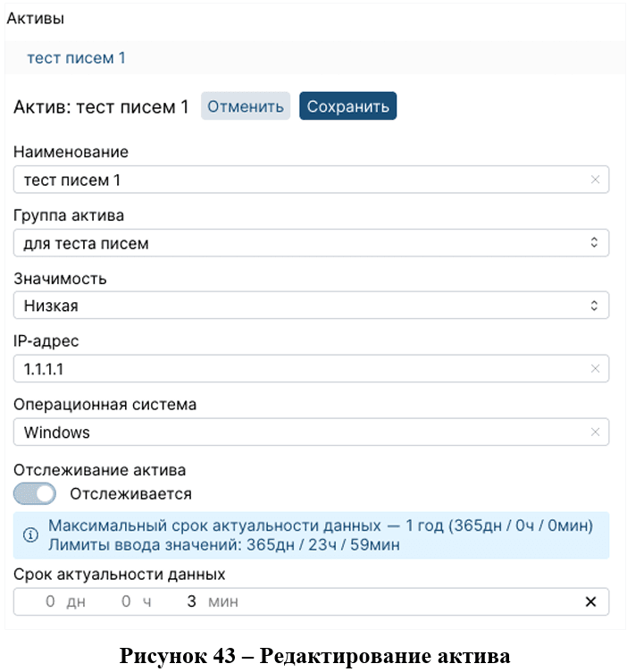 Для того, чтобы отредактировать актив необходимо перейти на сущность «Карточка актива». Для этого в правой части рабочей области страницы «Активы» (рис. 41) следует нажать на название актива "Асtiv: DC1". Система откроет новую страницу, где появится возможность внесения изменений (рис. 42).