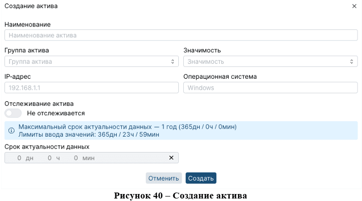 Следует обратить внимание, что в поле «Наименование» есть ограничение в 255 символов, в поле «Операционная система» ограничение в 50 символов, а в поле «IP-адрес» следует указывать данные в формате IPv4. В раскрывающемся списке «Значимость» необходимо выбрать уровень: высокая, средняя или низкая, а в раскрывающемся списке «Группа актива» – группу активов.
