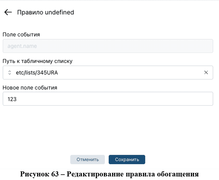 Для того, чтобы отредактировать правило обогащения, его нужно выбрать и нажать на соответствующую кнопку в боковой панели. После нажатия на кнопку "Редактировать" открывается боковое модальное окно (рис.63), в котором можно отредактировать «Путь к табличному списку» и «Новое поле события». Однако, «Поле события» является неизменным текстовым блоком.