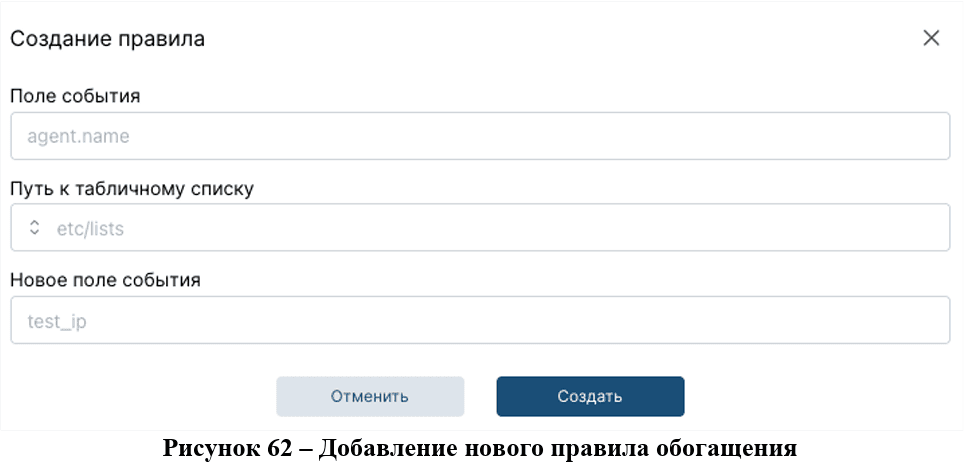 Для того, чтобы добавить правило обогащения необходимо перейти на страницу «Активные правила» категория «Обогащение» и нажать "+ Создать", после чего откроется модальное окно (рис.62) с полями для заполнения. Поля «Поле события» и «Новое поле события» являются обязательными для заполнения.