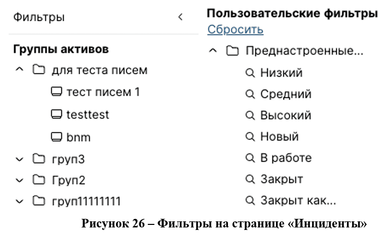 Также можно отфильтровать инциденты по активам, для этого стоит воспользоваться фильтрами «Группы активов» (рис.26).