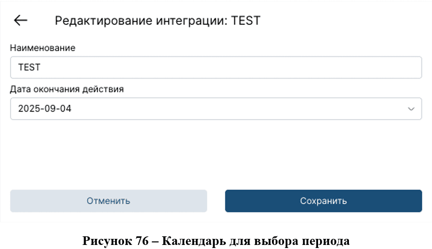 При нажатии на поле «Дата окончания действия» появится календарь с возможностью выбора даты (рис.74). После того, как выбранный срок истек токен станет неактуальный, и, соответственно, интеграция с системой станет невозможной: