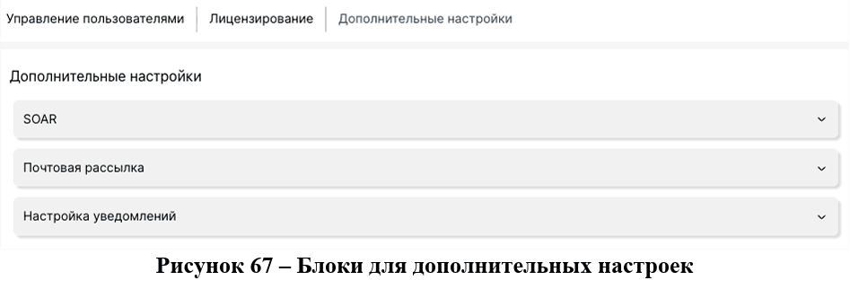 На странице «Дополнительные настройки» представлен функционал по настройкам системы, выходящий за рамки работы с пользователями и ролями, а также лицензирования продукта: настройка интеграции с SOAR-системой и почтовой рассылки, а также настройка уведомлений (рис. 67).