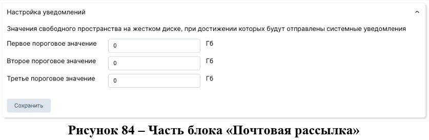 Для реализации настроек уведомлений в соответствующем блоке на странице представлены поля, доступные для редактирования (рис. 84). В каждое поле можно внести пороговые значения свободного пространства на жестком диске, при достижении которых будут отправлены системные уведомления.