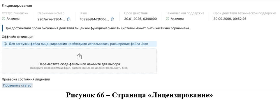 На странице «Лицензирование» представлен функционал, позволяющий просматривать информацию о лицензии (рис.65) и проверять состояние лицензии с помощью кнопки "Проверить статус". Инструкция по добавлению лицензии описана в Руководстве по установке.