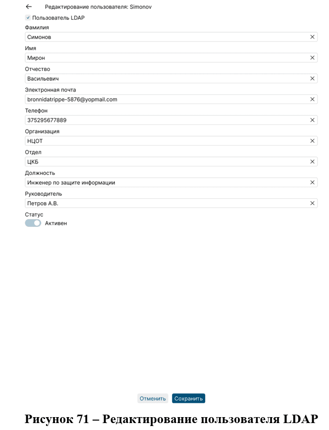 Для редактирования информации о пользователе LDAP необходимо нажать на кнопку «Редактировать» в таблице с подробной информацией о пользователе. При нажатии на нее открывается боковое модальное окно, в котором поля с текстовой информацией станут доступными для изменения (рис.71).