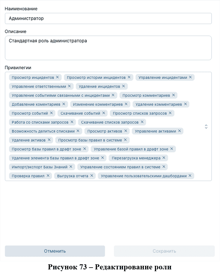 Для редактирования информации о роли необходимо в боковом окне с подробной информацией нажать на кнопку «Редактировать», появится модальное окно и поля станут доступными для изменения (рис. 73).