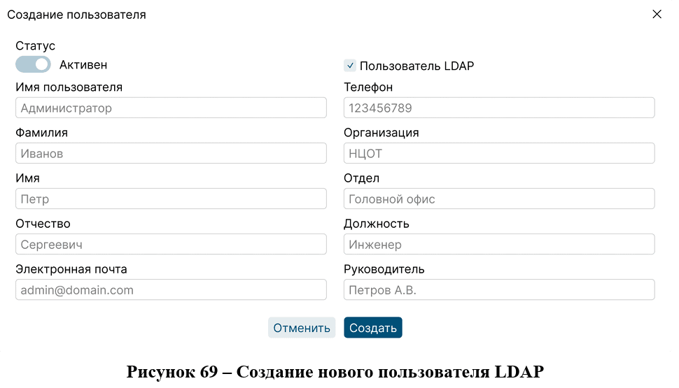 Для создания пользователя LDAP необходимо поставить галочку в чекбоксе "Пользователь LDAP" и появится форма (рис.69).