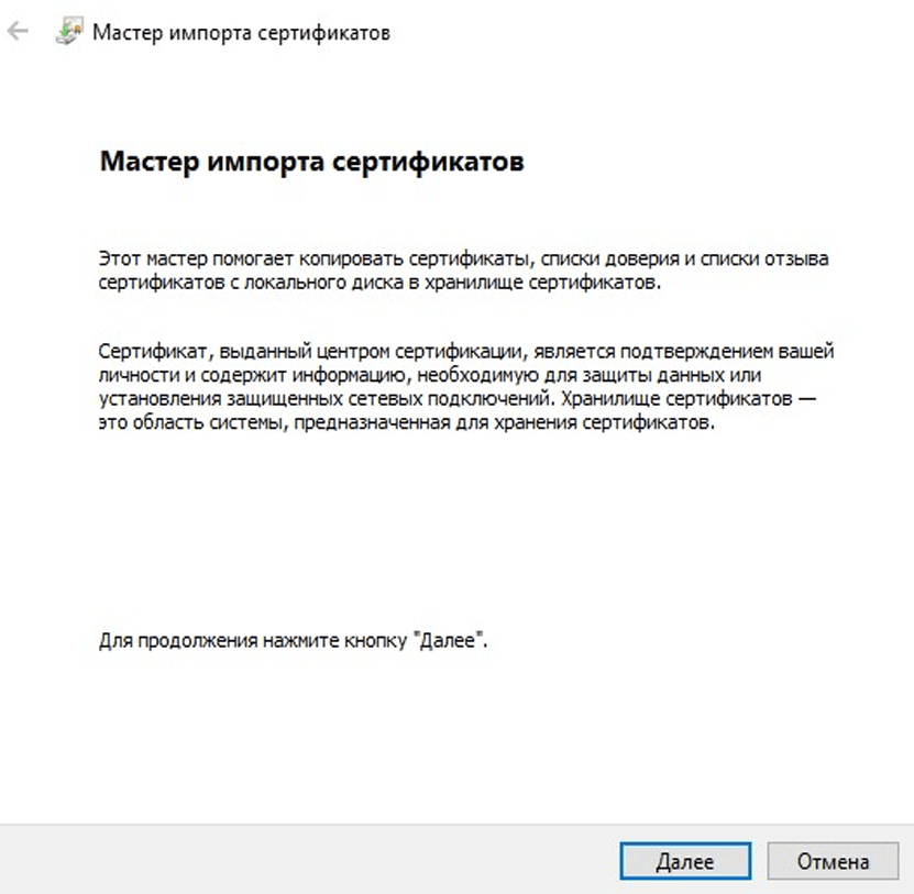 Для установки сертификата следует перейти на вкладку «Доверенные корневые центры сертификации» и нажмите кнопку «Импорт...». Откроется окно «Мастер импорта сертификатов» (рис. 16).