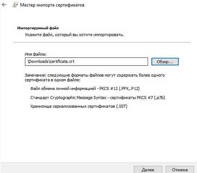В открывшемся окне «Мастер импорта сертификатов» помощника нажать «Далее», откроется окно «Импортируемый файл» (рис. 17). Далее необходимо нажать кнопку «Обзор», выбрать ранее скачанный сертификат (рис. 18).