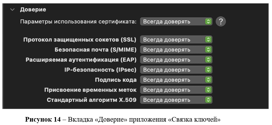 Затем в настройках системы открыть приложение «Связка ключей». Во вкладке «Сертификаты», выбрать нужный файл с сертификатом и открыть его (например, двойным нажатием). Перейти во вложенный список «Доверие» и выбрать вариант «Всегда доверять» (рис. 14), ввести пароль, при необходимости и закрыть приложение «Связка ключей» (см. подробную информацию в справочном центре Apple).