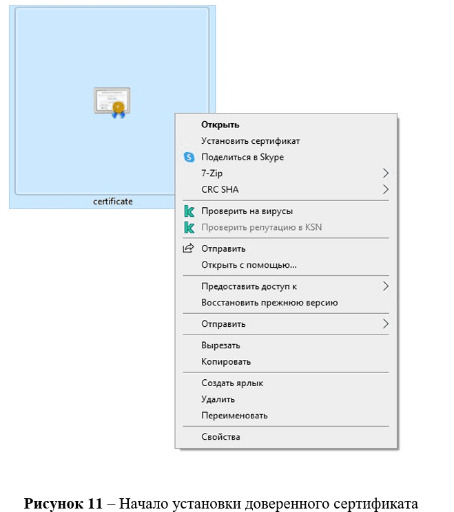 На файле корневого сертификата нажмите правой кнопкой мыши и выберите «Установить сертификат» (рис. 11). В открывшемся окне «Мастер импорта сертификатов» помощника установки выберите необходимый пункт и нажмите «Далее».