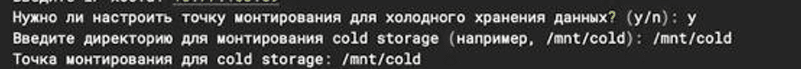 - Необходима ли настройка точки монтирования для холодного хранения данных. Варианты ответа:y/n. Если есть такая необходимость, то ввести :у. Далее будет предложено ввести директорию для монтирования cold storage (рис. 7). Если была выбрана опция ответа :n, то монтирование дискового пространства будет по стандартной схеме;