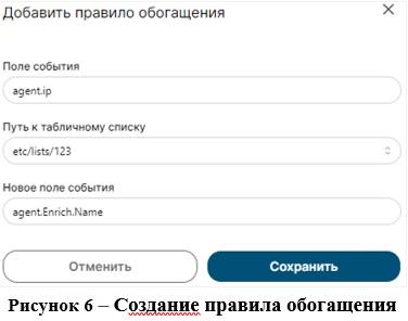 Далее все события, поступающие с IP-адресов указанных в табличном списке test123, будут обогащены полем «agent.Enrich.Name», в котором будут данные, указанные в поле «Значение» в табличном списке test123.