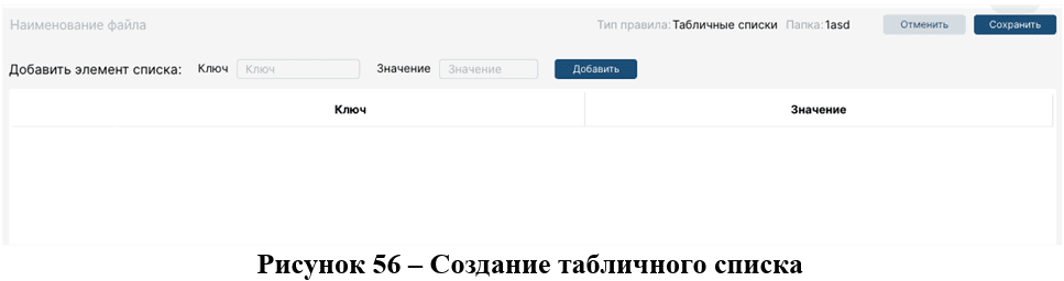 После того как, выбрана папка, следует нажать "Создать" и появится модальное окно для создания табличного списка с редактируемыми полями для названия файла и ввода значений (рис.56). Наименование табличного списка должно быть на латинице.