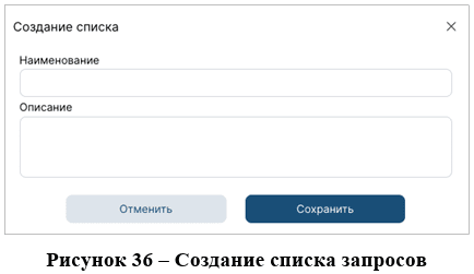 Для того, чтобы создать новый список запросов следует перейти на страницу «Списки запросов» и нажать на кнопку "Создать список". Далее откроется модальное окно (рис.36), где необходимо заполнить поля. Поле «Наименование» является обязательным.