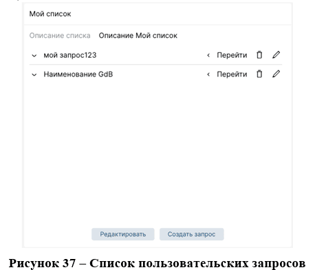 Для сохранения запроса нужно нажать на кнопку «Сохранить», а для отмены – «Отменить». Следует обратить внимание, что при нажатии на кнопку "❌︎" процесс создания будет прерван, и все введенные данные будут потеряны. Рабочая область страницы разделена на две части: левая часть представляет собой перечень списков запросов, правая – боковую панель с подробной информацией о выбранном списке и кнопками для дополнительных действий (рис. 37).
