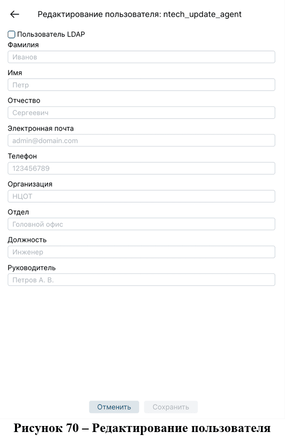 Для редактирования информации о пользователе LDAP необходимо нажать на кнопку «Редактировать» в таблице с подробной информацией о пользователе. При нажатии на нее открывается боковое модальное окно, в котором поля с текстовой информацией станут доступными для изменения (рис.71).