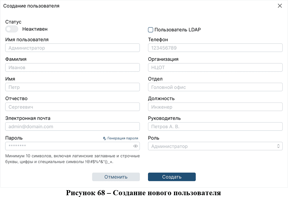 Для сохранения нового пользователя нужно нажать на кнопку «Создать». Если пользователь не подтверждает свое действие, нажав на кнопку «Отменить», или закрывает окно "❌︎", несохраненные данные будут утеряны.