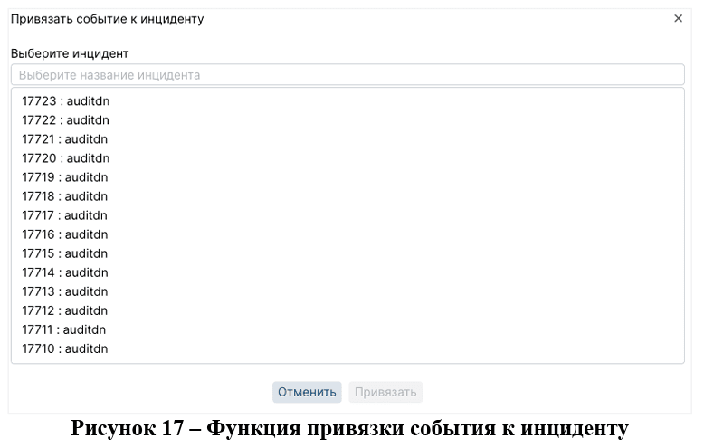 Далее следует выбрать существующий инцидент из списка и нажать на кнопку «Привязать». Для закрытия окна необходимо нажать на кнопку или на кнопку «Отменить». Следует обратить внимание, что к одному инциденту можно привязать несколько событий.