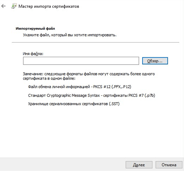 В открывшемся окне «Мастер импорта сертификатов» помощника нажать «Далее», откроется окно «Импортируемый файл» (рис. 17). Далее необходимо нажать кнопку «Обзор», выбрать ранее скачанный сертификат (рис. 18).