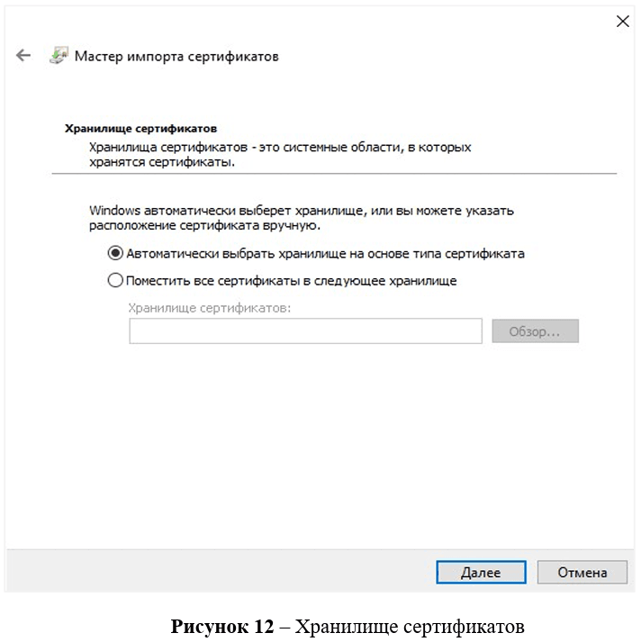 На странице «Хранилище сертификатов» нужно выбрать «Поместить все сертификаты в следующее хранилище», выберите «Обзор», найдите необходимую папку для сертификата и затем нажмите кнопку «Далее» (рис. 12).
