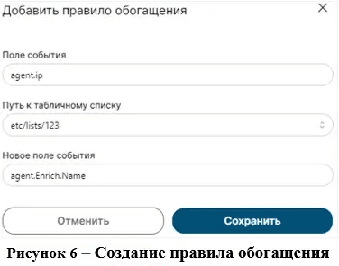 Далее все события, поступающие с IP-адресов указанных в табличном списке test123, будут обогащены полем «agent.Enrich.Name», в котором будут данные, указанные в поле «Значение» в табличном списке test123.